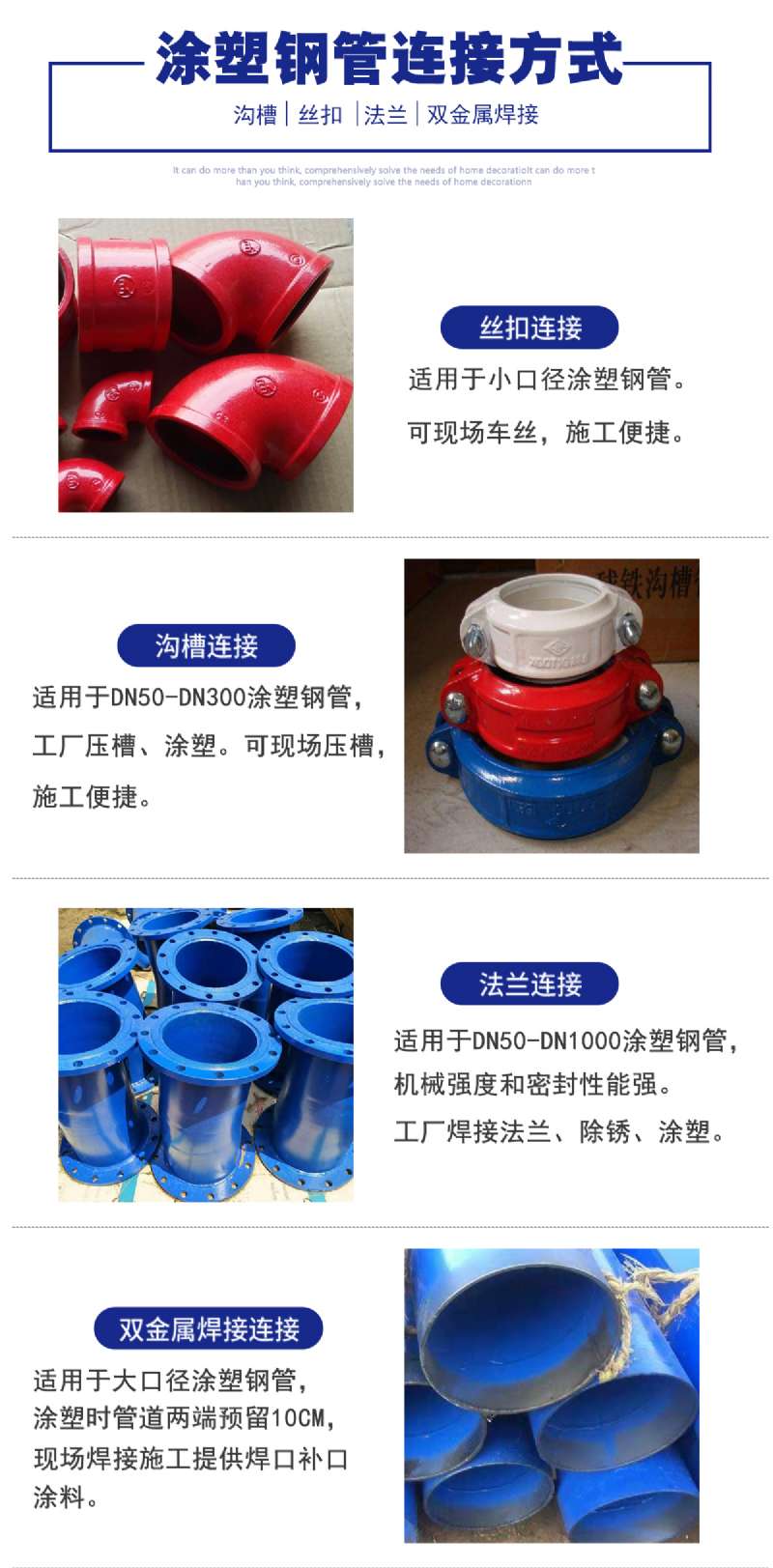 、京滬鐵路穿插過境,國內運輸非常便當;此外距天津新港僅200公里,為出口事務提供了更為便當的條件。豐厚的地域資本,優(yōu)勝的區(qū)位條件,使我廠迅速發(fā)展成為集管件研發(fā)、開發(fā)、出產于一體的省科技公司、國內大型專業(yè)管業(yè)制造廠。公司主要生產銷售產品:涂塑鋼管、內外涂塑鋼管,給排水涂塑鋼管,冷水用給排水涂塑鋼管、熱水用給排水涂塑復合管、鋼塑復合管,涂塑電纜套管,消防涂塑鋼管、煤礦井下專用涂塑鋼管、熱浸塑電纜涂塑保護管、襯塑鋼管、包塑鋼管等。