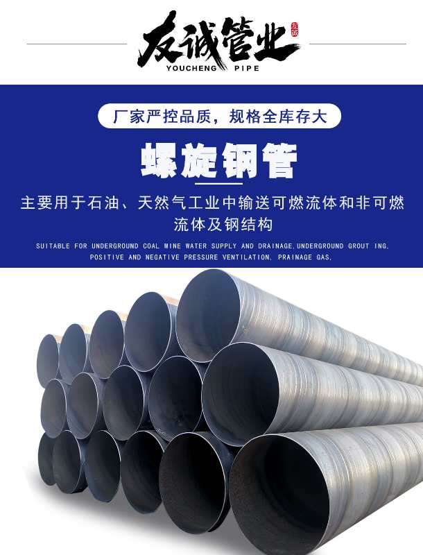 8.承壓流體輸送用埋弧焊螺旋焊管規(guī)格(SY5036-83)是以熱軋鋼帶卷作管坯,經(jīng)常溫螺旋成型,用雙面埋弧焊法焊接,用于承壓流體輸送的螺旋縫鋼管。鋼管承壓能力強(qiáng),焊接性能好,經(jīng)過各種嚴(yán)格的科學(xué)檢驗(yàn)和測試,使用安全可靠。鋼管口徑大,輸送效率高,并可節(jié)約鋪設(shè)管線的投資。主要用于輸送石油、天然氣的管線。