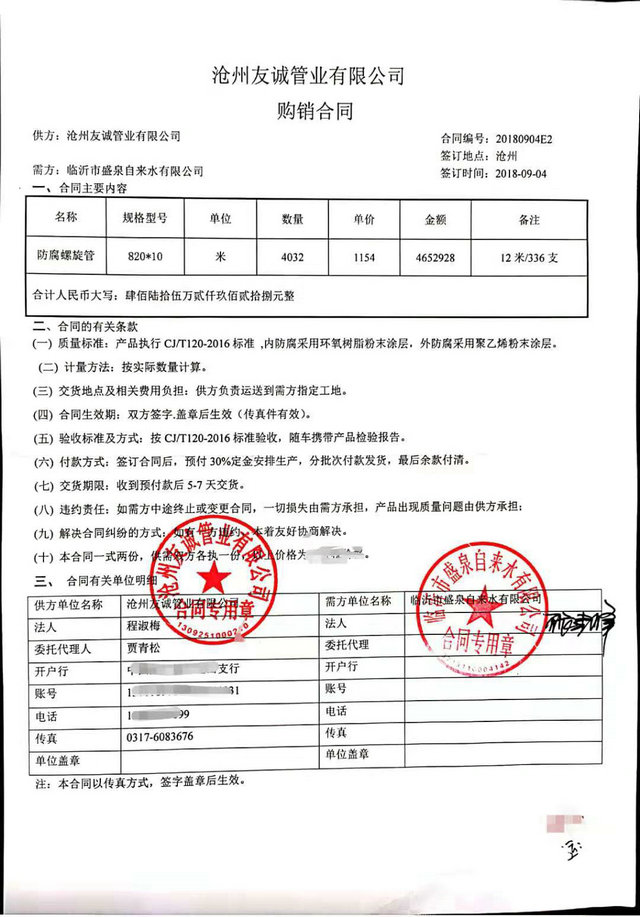 2018年9月我公司與沂州水務集團臨沂市盛泉自來水有限公司簽訂TPEP防腐螺旋鋼管購銷合同,DN800內(nèi)外防腐鋼管4000米,感謝張總的信任,與貴公司的合同讓我們公司在自來水管道領域有了一個新的突破,歡迎各界領域客戶前來合作。
